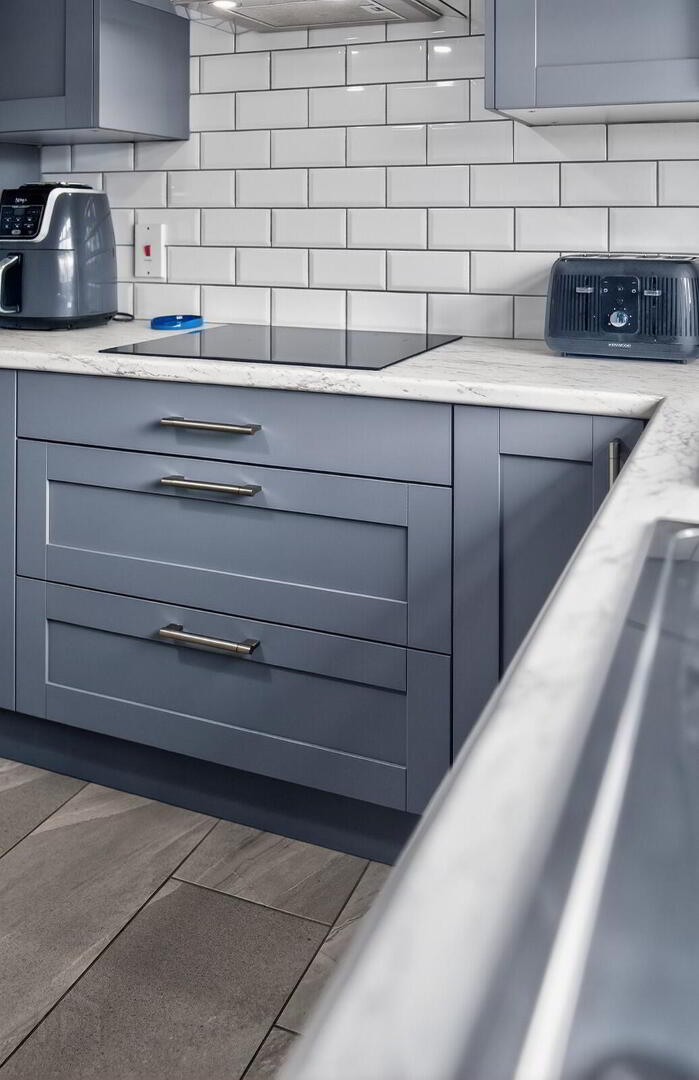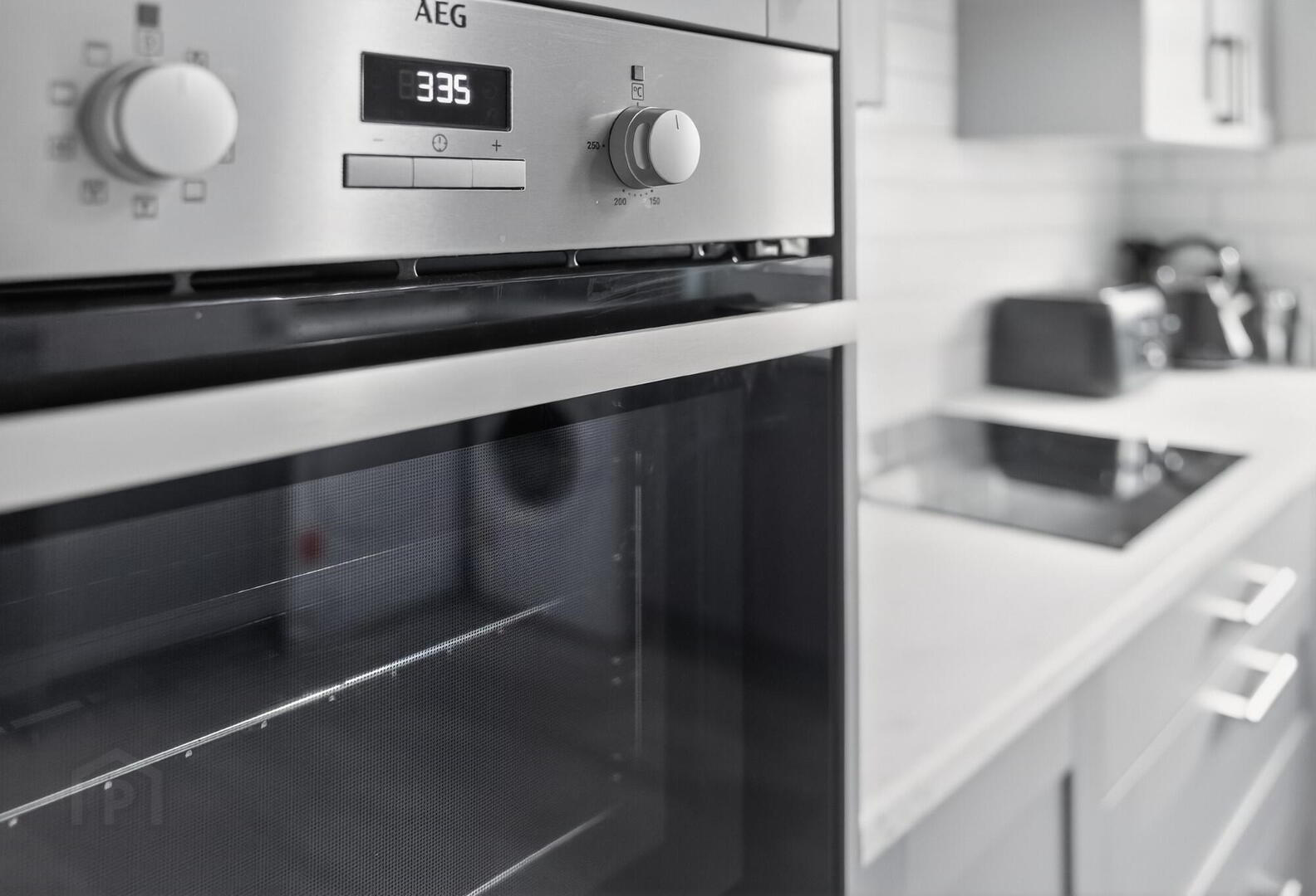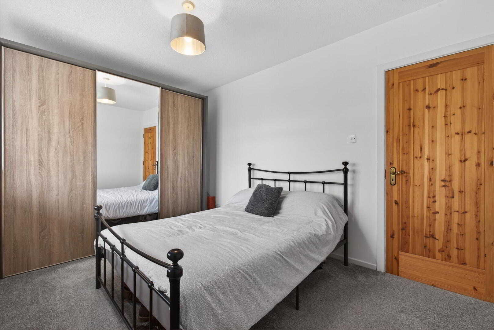 Modern fitted kitchen with wide range of high and low level units. Ceramic hob and electric oven. Integrated fridge freezer and dishwasher. Tiled floor. Part tiled walls. View to rear.