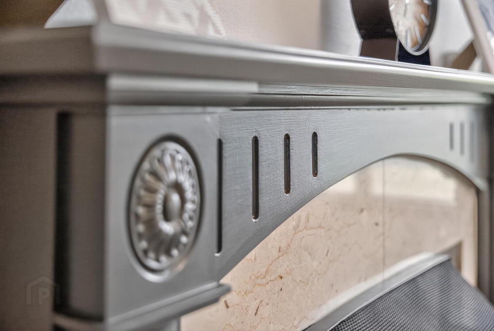 View to front. Tiled fireplace with cast iron insert. Wooden floor. Archway to dining room.