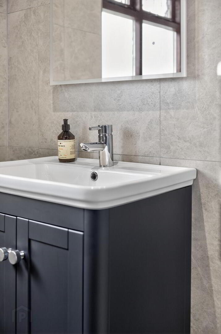 White suite with double ended freestanding bath and separate shower cubicle. Heated towel rail. Fully tiled