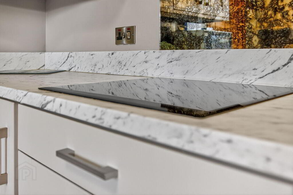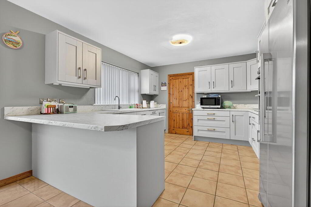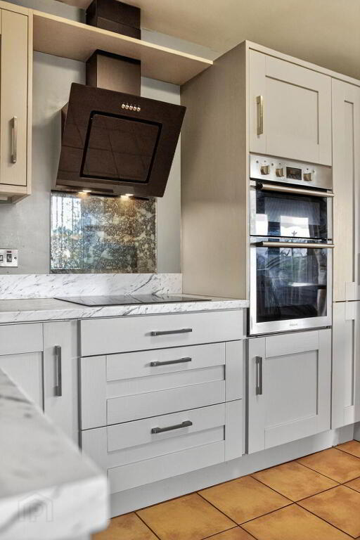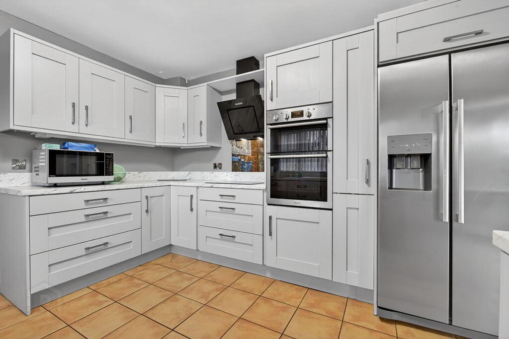 - Fitted kitchen with a good range of eye and low level units. Breakfast bar. Integrated dishwasher. Electric hob and double oven. Extractor fan. American style fridge/freezer. Tiled floor. Dining area.Tiled floor. Patio doors to rear.